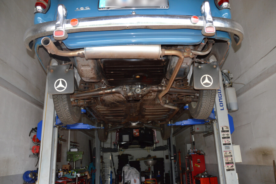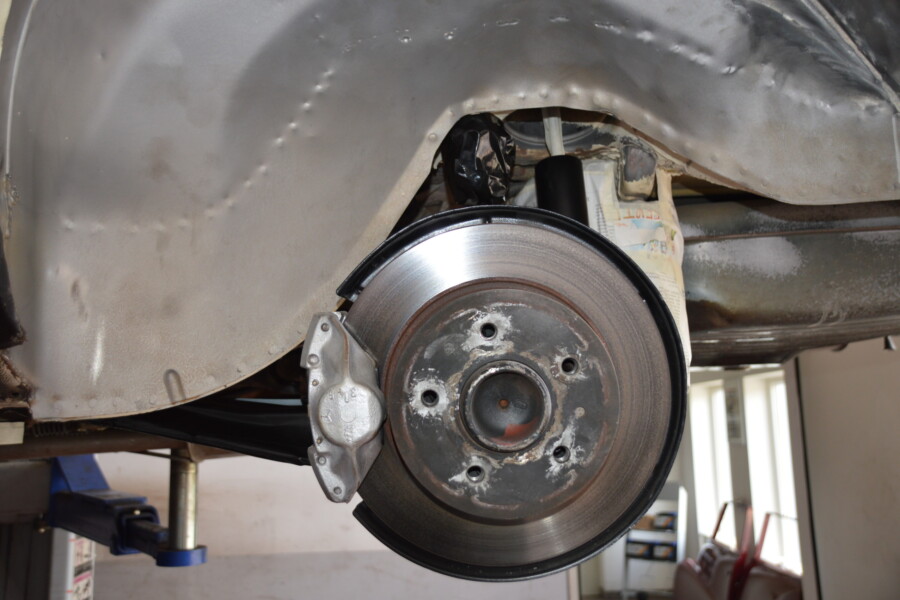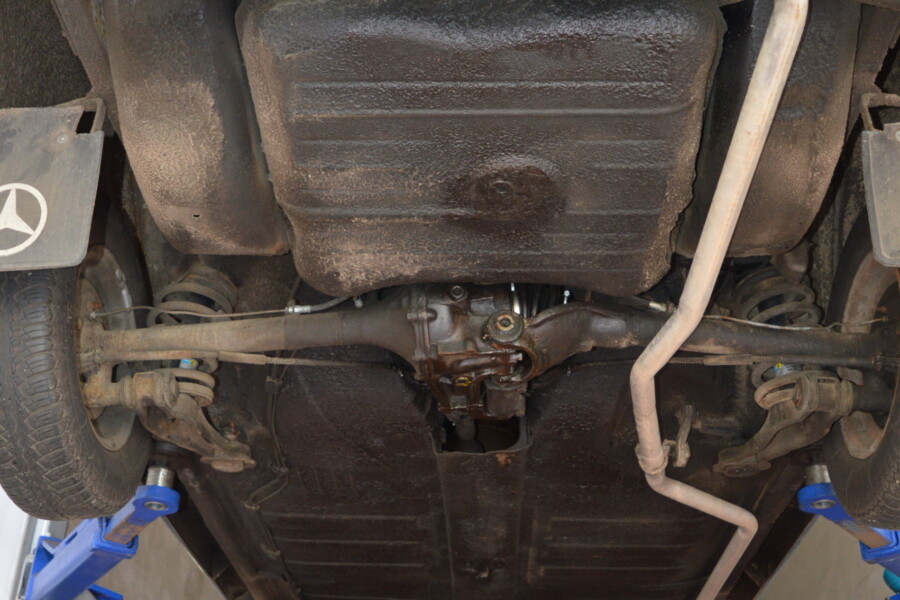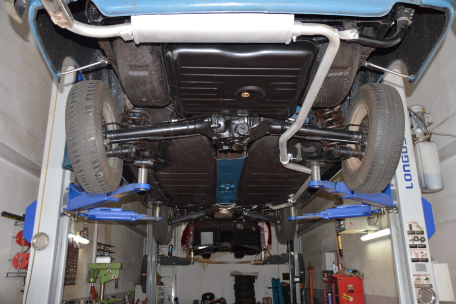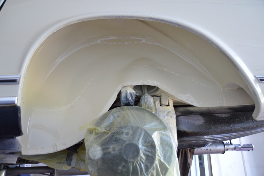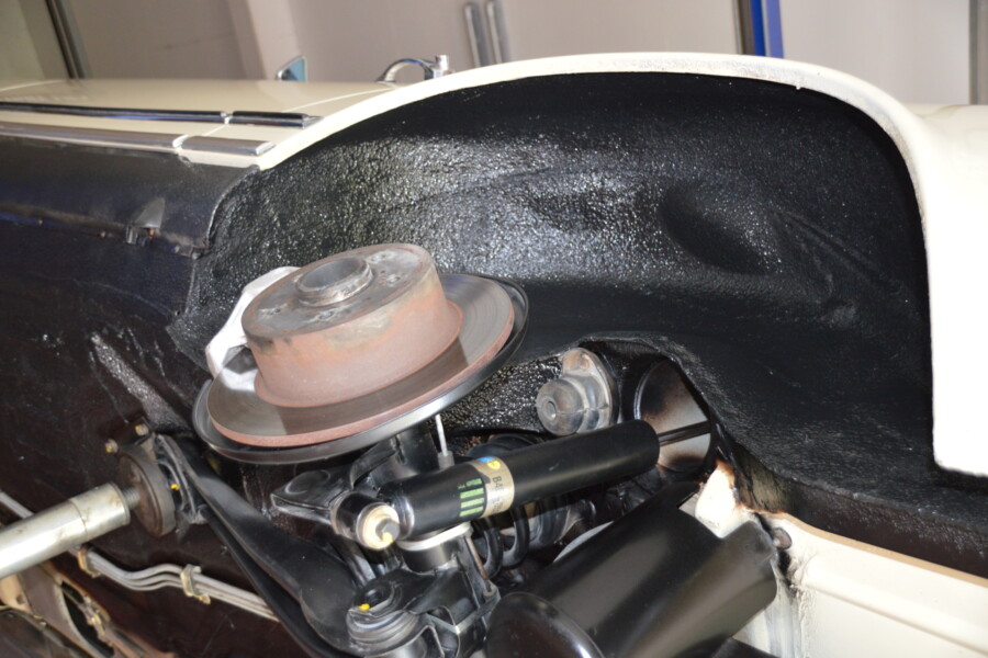 Gute Ansicht einer kompletten Versiegelung des hinteren Unterbodens, nachdem die Seitenwand, Federaufnahme und Längsrahmen instandgesetzt wurden.